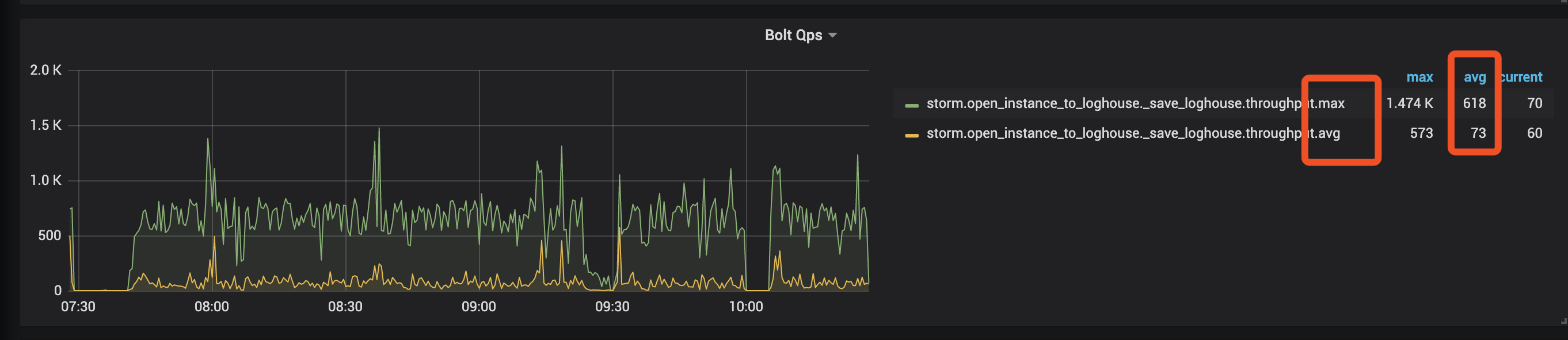 可以在Flink指标中查看每个算子QPS的最大值和平均值。如果这两个值之间存在显著差异,则表明存在数据倾斜。如下图所示,如果Bolt的每秒查询量(QPS)的最大值与平均值相差约9倍,则表明存在数据倾斜。