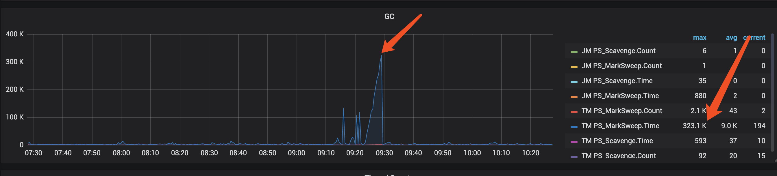 如果反压呈现周期性特征,每隔一段时间出现一次,与 Full GC 频率高度相关。在默认的Flink仪表盘中,有YGC和FGC的指标。请根据需要查看相关指标。通常,只需关注FULL GC指标即可。